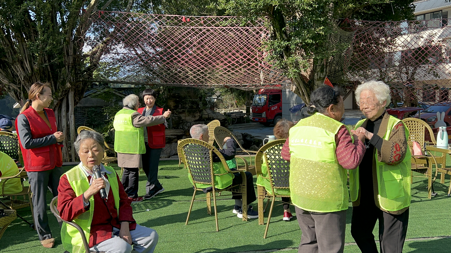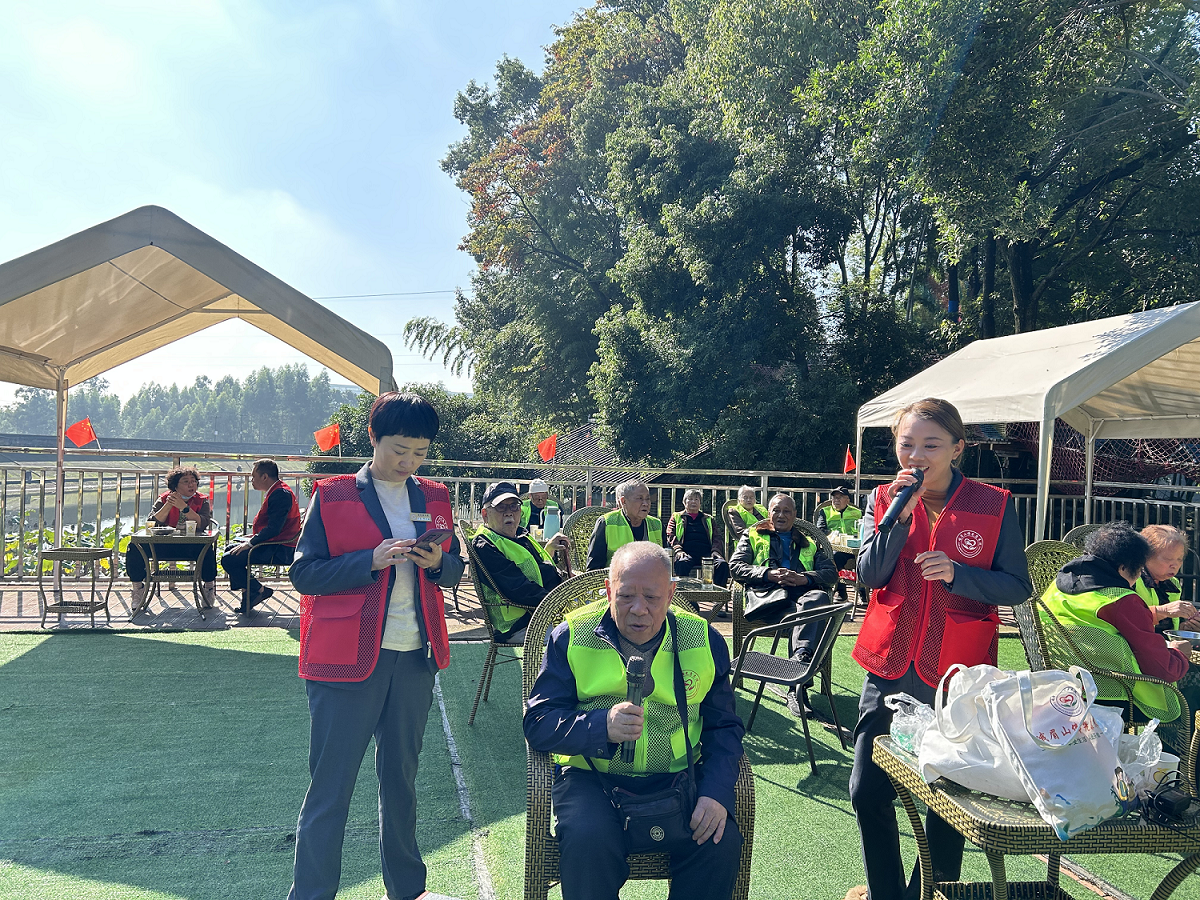 抵达峨眉山市御景山庄后,清新的田野气息扑面而来。在工作人员引导下,长辈们沿平缓步道漫步赏秋,金黄景致与和煦阳光相映,大家不时与同伴分享美好,脸上满是惬意。随后,热闹的互动环节拉开帷幕,唱歌跳舞、投掷沙包等游戏轮番上演,长辈们热情高涨,有的轻声哼唱熟悉旋律,有的活力参与沙包投掷,现场欢呼声与笑声此起彼伏,欢乐氛围格外浓厚。